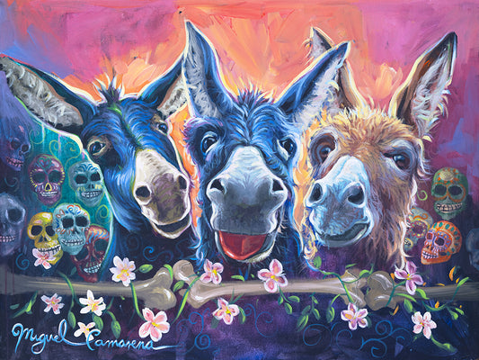 Tres Day of The Dead Donkeys Print on Canvas by Miguel Camarena